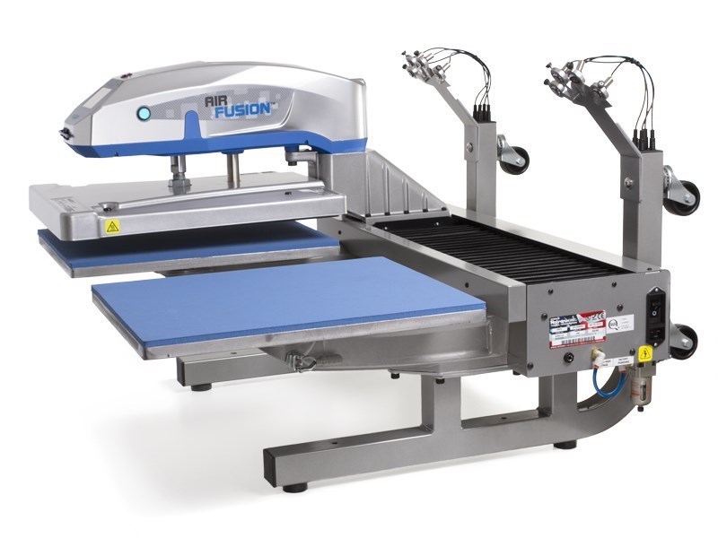 2개의 열 인쇄 스테이션이 있는 Dual Air Fusion IQ 열 프레스는 다른 스테이션이 눌려지는 동안 한 스테이션에서 스레딩 및 레이아웃을 허용하여 효율성을 높입니다. 대량 작업 및 DTG 인쇄에 적합합니다. 한 스테이션은 사전 처리용으로 설정하고 다른 스테이션은 후 경화용으로 설정합니다.